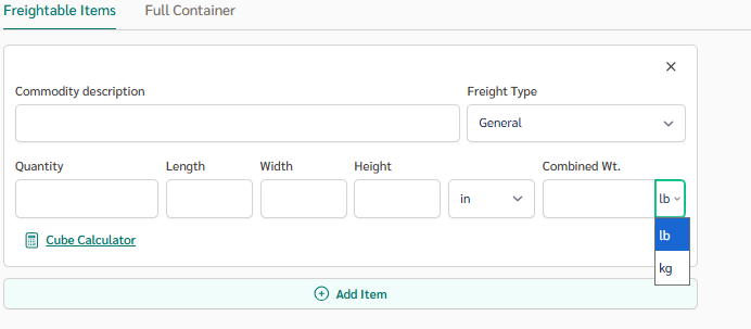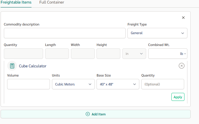 For palletized or volume-based shipments, click Cube Calculator. This allows you to quote by volume instead of manually entering dimensions.